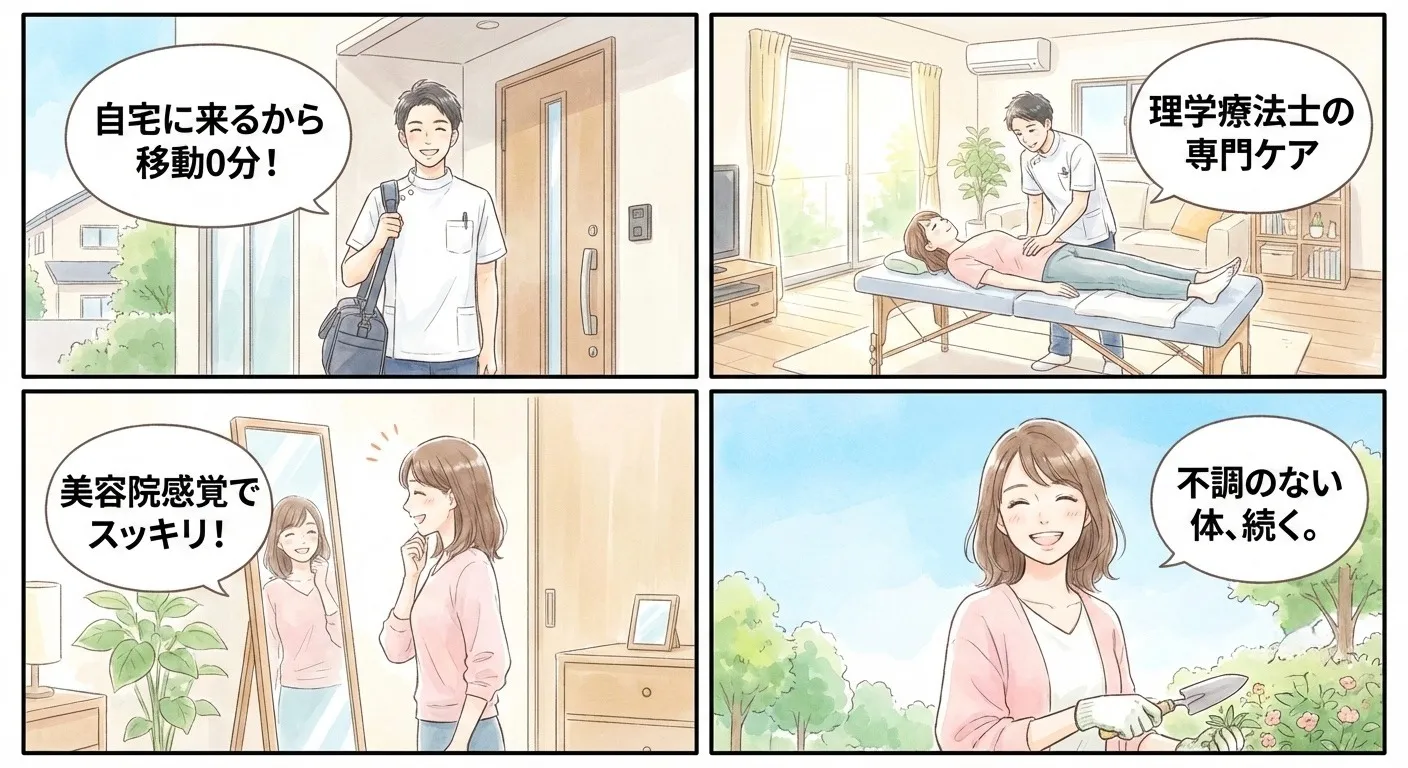 理学療法士の資格を持つスタッフによる出張整体サービスにご満足いただけたとのこと、大変嬉しく思います。ご自宅でリラックスして施術を受けていただけたようで、何よりです。