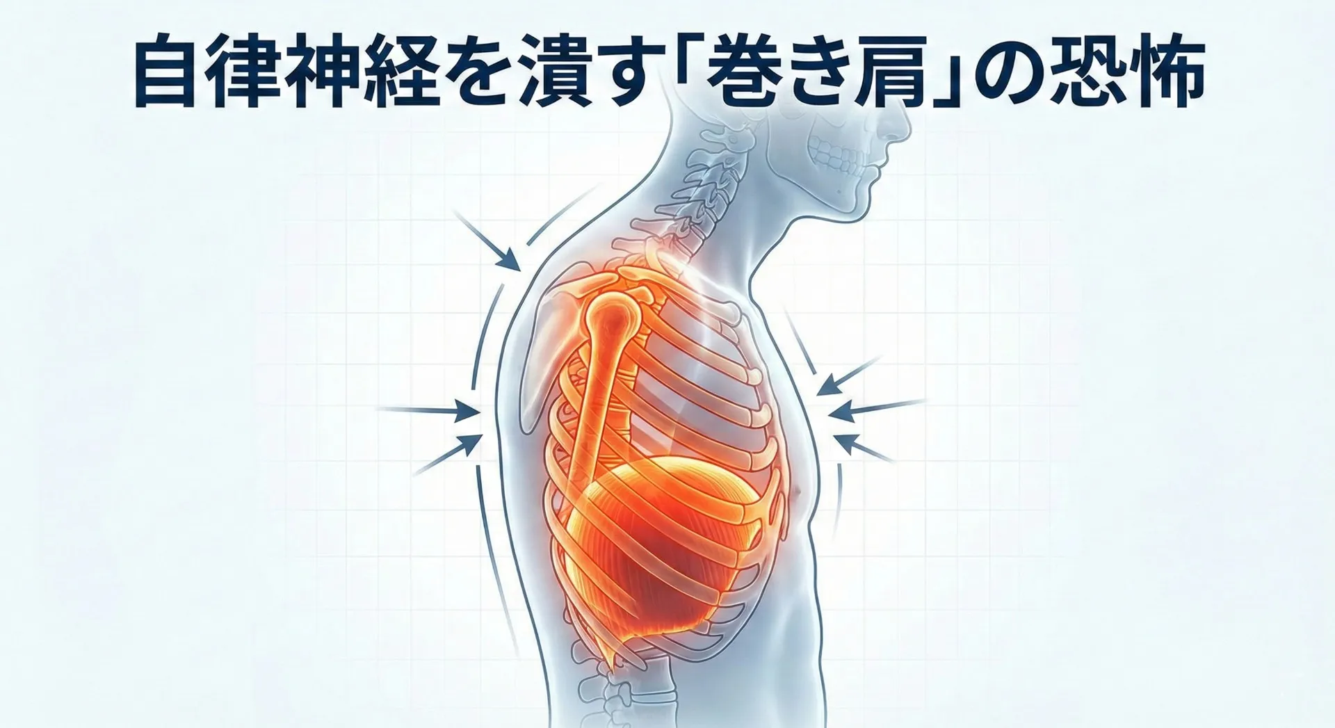 巻き肩による胸郭の圧迫は、単なる姿勢の問題にとどまらず、横隔膜の動きを大きく制限します。これにより全身への酸素供給が不足し、脳や内臓が常に緊張・興奮状態となりやすくなります。