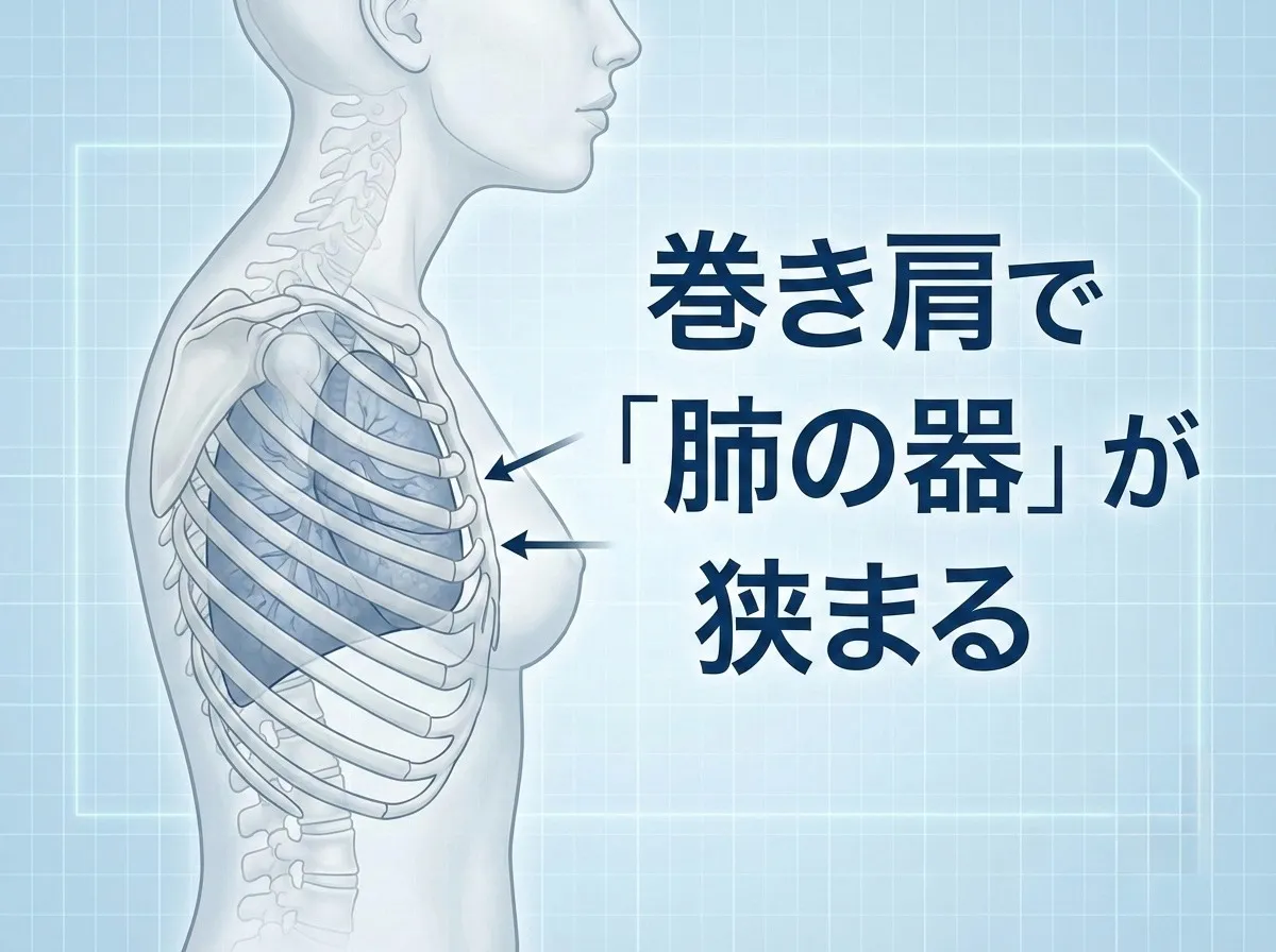 巻き肩とは、肩が内側に巻き込み胸が閉じた姿勢を指します。この姿勢が定着すると、肋骨周りの筋肉が硬直し、胸郭が圧迫されてしまいます。その結果、横隔膜の上下運動が妨げられ、呼吸が自然と浅くなるのです。