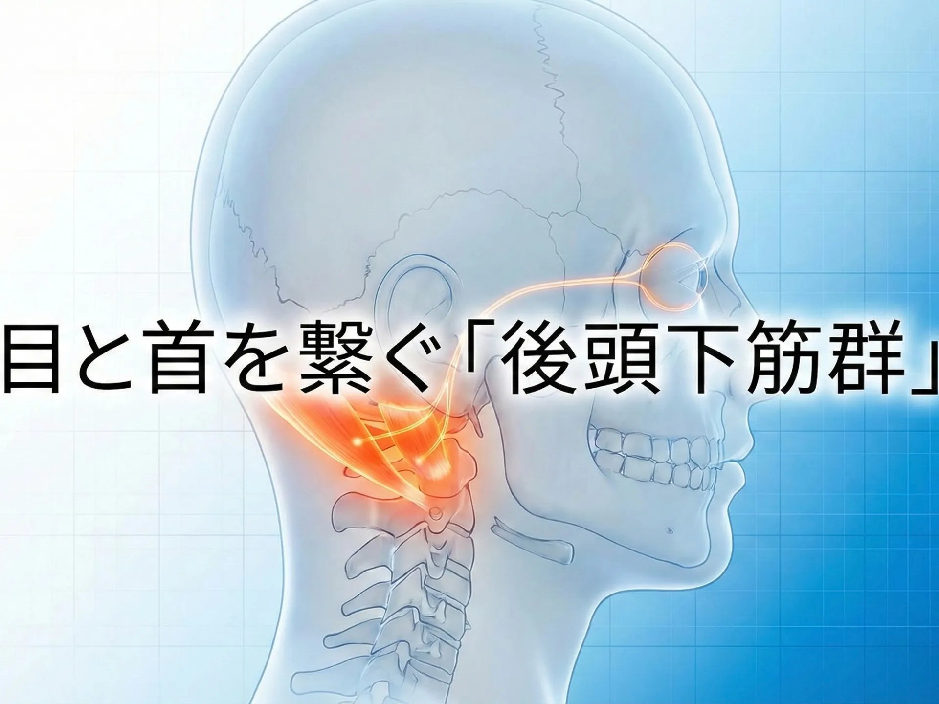 このような悩みを根本から改善するためには、痛みの出ている部分だけでなく、眼球運動と連動する首の深層筋(後頭下筋群)や全身の姿勢バランスにも着目した施術思考が必要です。症状の表面だけを追うのではなく、解剖学的な根拠をもとに原因を突き止め、全身のつながりを意識したアプローチが重要となります。