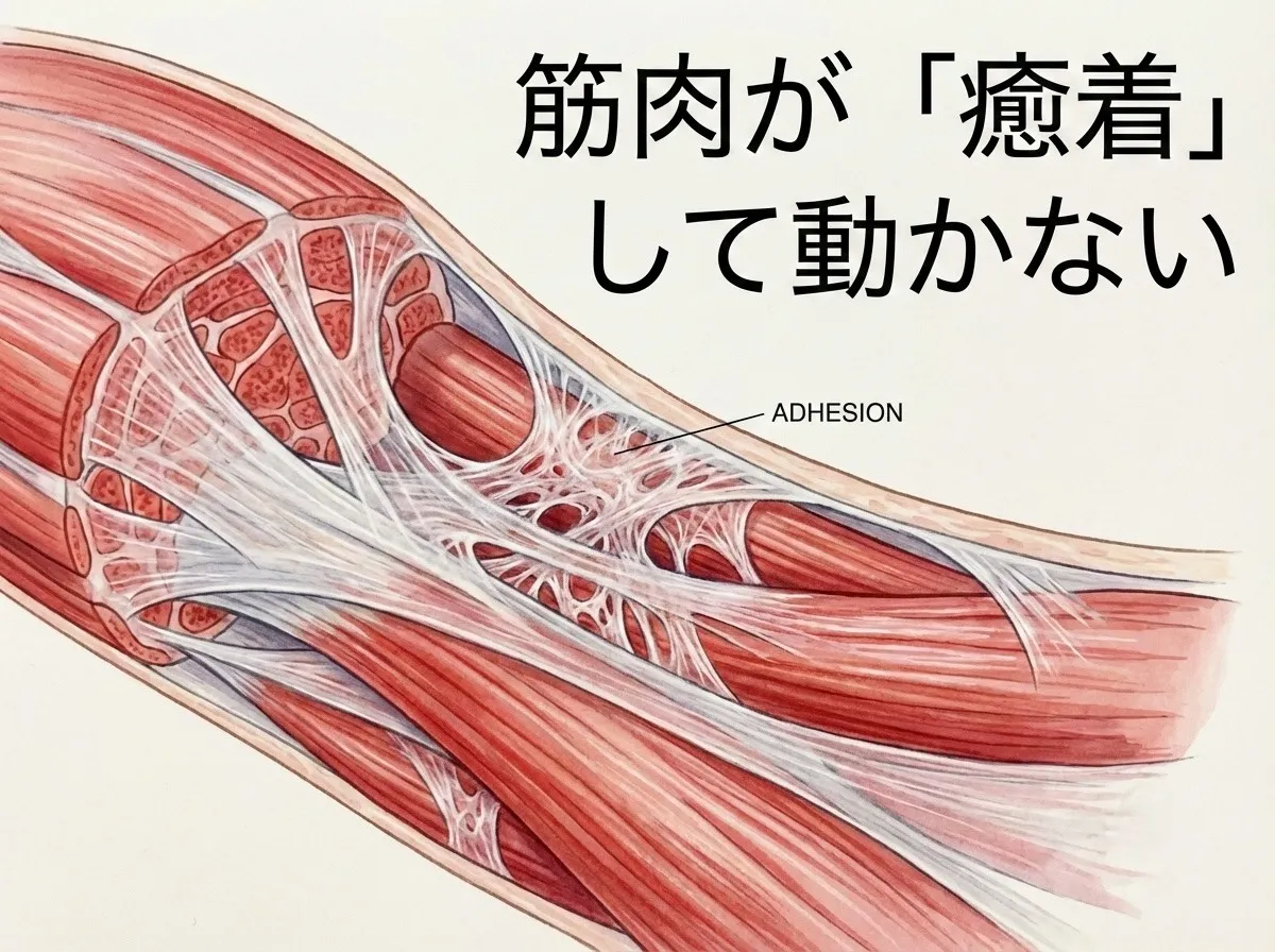 筋膜癒着とは、筋肉を包む筋膜が硬くなり、動きが悪くなる状態です。これが慢性的なコリや痛み、可動域制限の大きな要因となります。筋膜癒着を改善するには、強い刺激で無理に剥がすのではなく、解剖学的な知識に基づいた優しい手技が重要です。