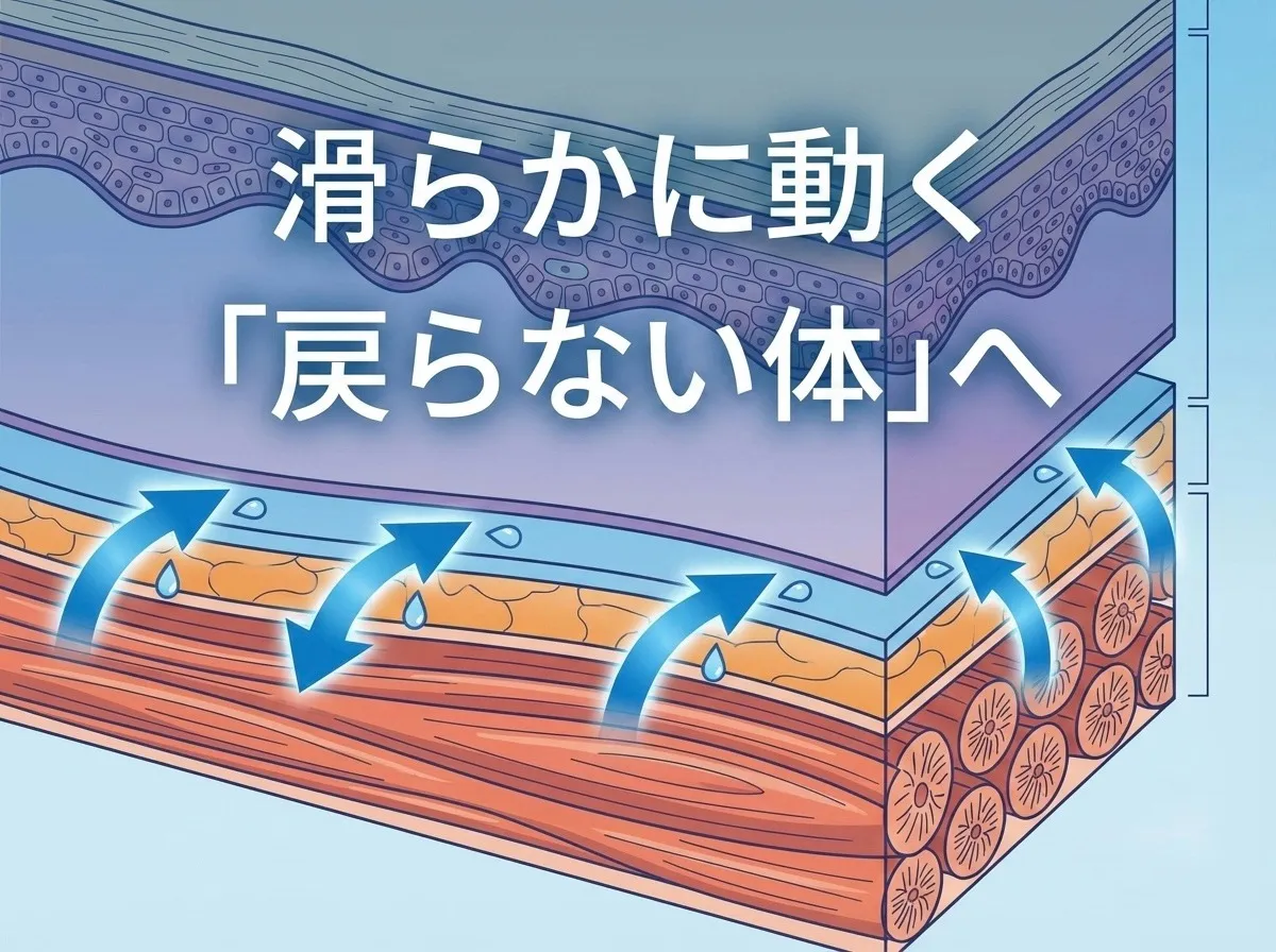 整体を受けた直後は体が軽くなったと感じても、しばらくすると元の重さやこりが戻ってしまうと悩む方が多いです。実はこの“戻り”の原因の一つが、皮膚と筋膜の癒着にあります。癒着とは、皮膚とその下の組織が滑らかに動かなくなる状態で、筋膜や皮膚の柔軟性が低下し、血流も悪くなりがちです。