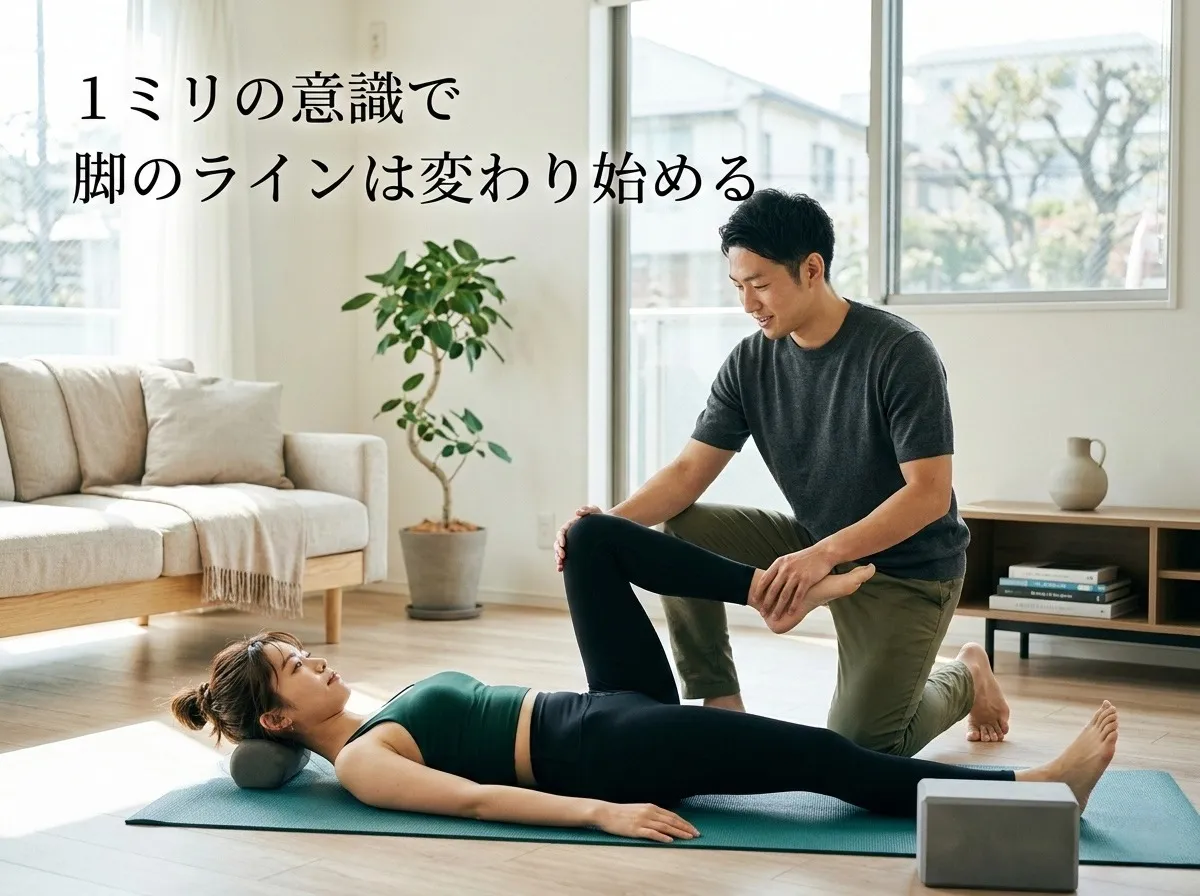 この“1ミリ”は、無理な力を加えずに骨盤や股関節の位置を微細に整えていく感覚を指します。大きく動かすのではなく、脚の付け根がほんの少し外側に開く・閉じる、そのごくわずかな変化を感じ取ることが、ねじれ解消の第一歩です。