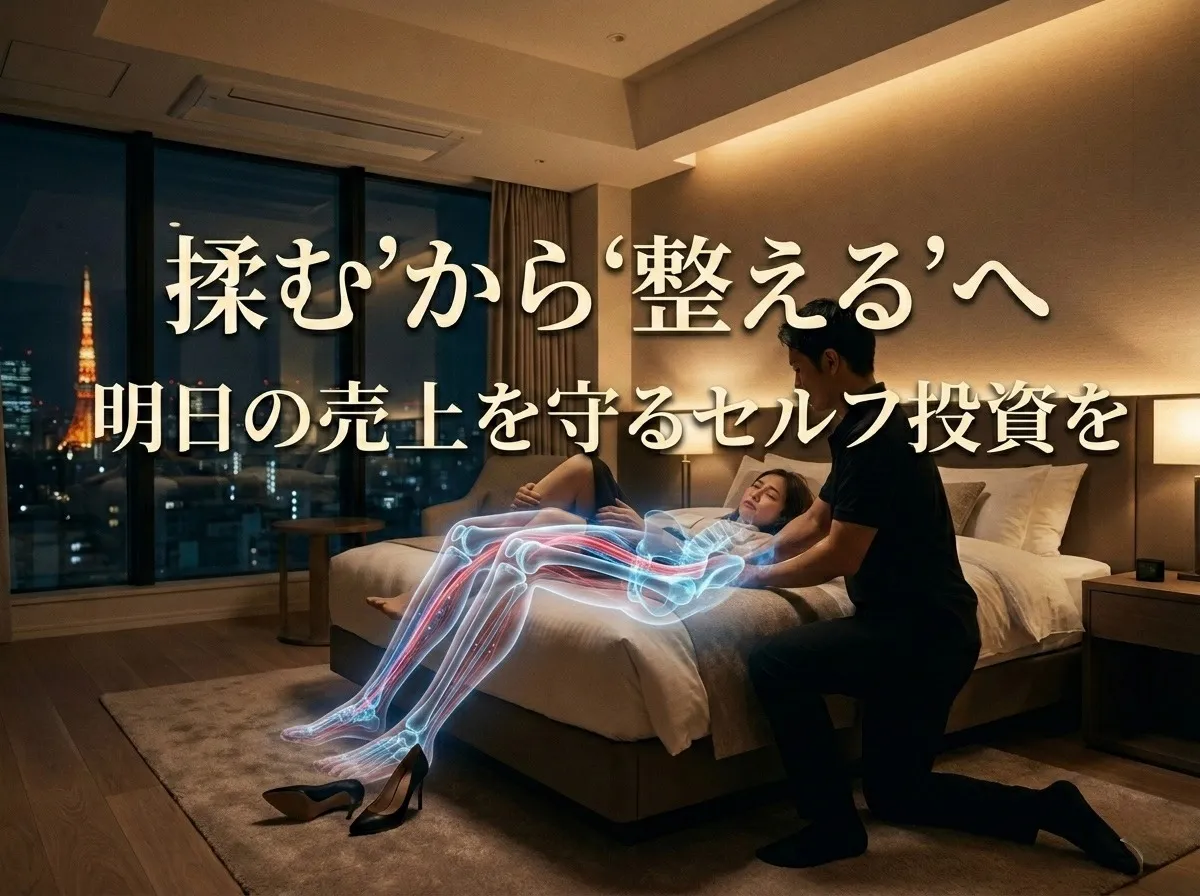 港区のナイトワークで活躍する方々は、脚の疲れやむくみに敏感です。そんな皆さんが実践しているのが、毎晩の骨格メンテナンス習慣。ヒールで過ごした脚は想像以上に負担がかかっていて、放置すれば「ホースのねじれ(大腿骨の内旋)」が進み、股関節や鼠径部の圧迫につながる可能性があります。