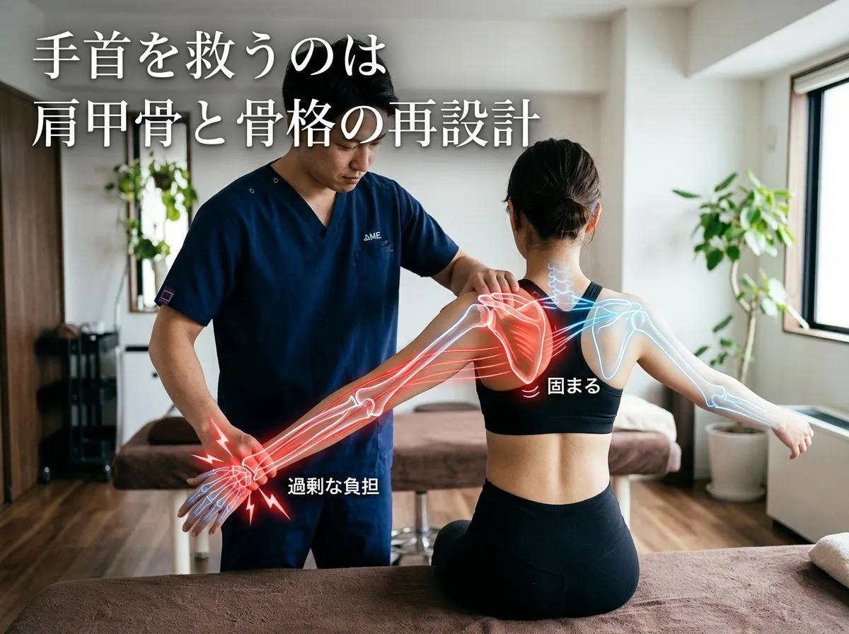 このような背景から、骨盤や体幹の再調整が不可欠であり、手首だけの対処では根本的な解決につながらないことを、現場で痛感しています。
