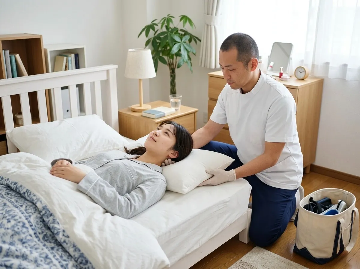 自律神経・疲労の根本改善には、背骨ケアが不可欠です。訪問整体では、自宅という安心できる環境で施術を受けられるため、脳のリラックス状態(α波優位)を引き出しやすくなります。理学療法士が実際の寝具や寝室環境を評価し、その場で身体に合った調整を行うことで、睡眠の質向上に直結します。